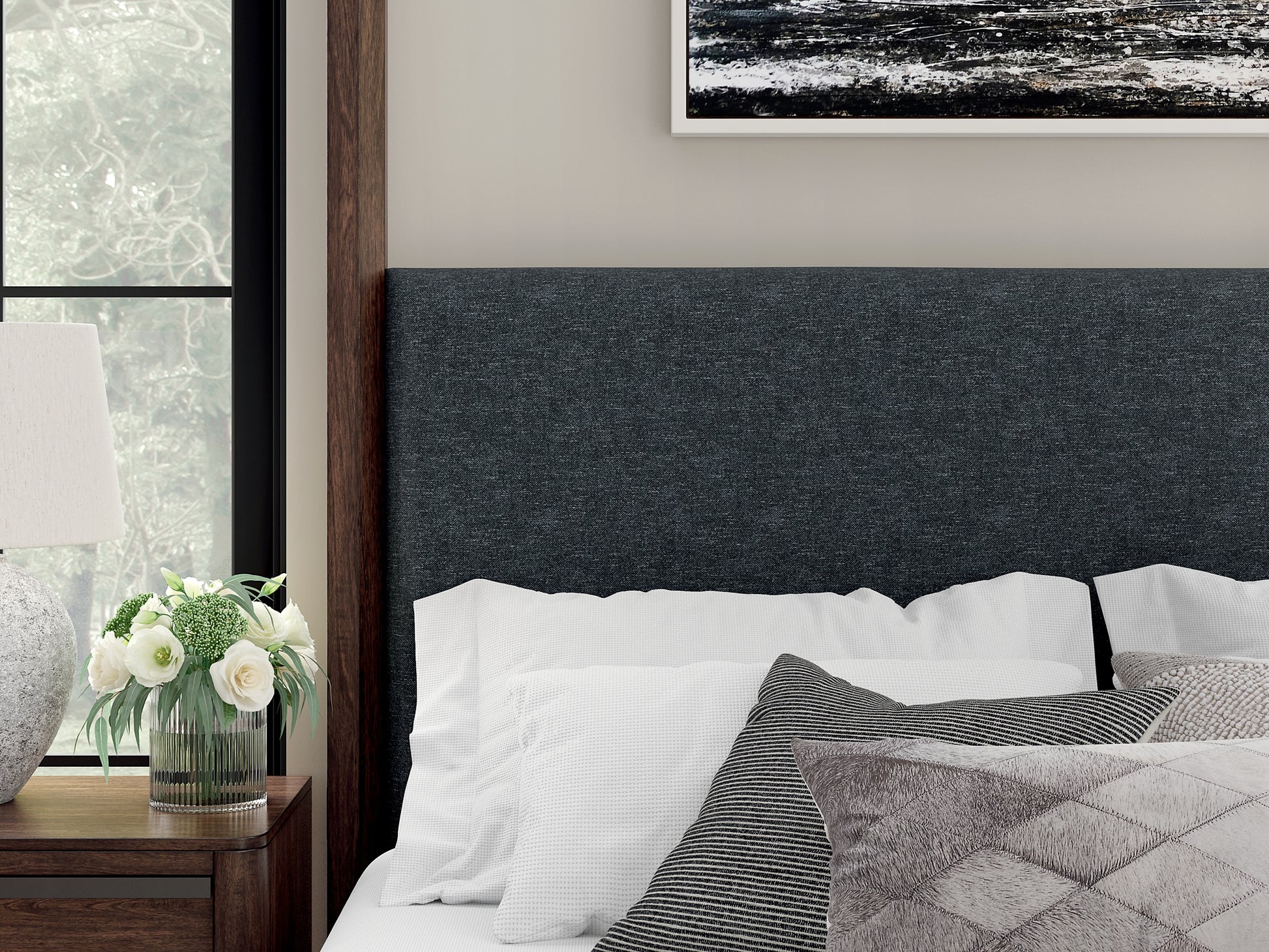 Casual contemporary styling with a decidedly modern vibe. Bathed in a rich dark brown finish, this queen canopy bed is warm and inviting. Its integrated “X” canopy and full wrap-around rails set to the floor adorn your restful retreat with on-trend elegance. Dual USB charging on both sides of the upholstered headboard is a subtly cool way to keep your electronics at the ready. What a simply stunning way to achieve the bedroom of your dreams.