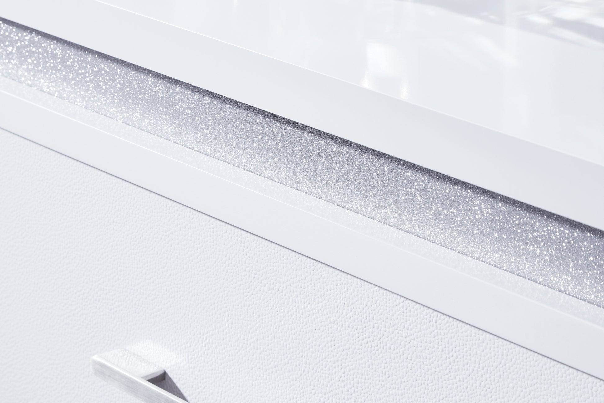 Details | Made with hardwood solids and MDF substrates, White paint finish, Inset acrylic glitter accents, Horizontal metal drawer pulls, 6 drawers with fully finished interiors, dovetail construction and heavy duty ball-bearing side glides, Textured drawer fronts | |